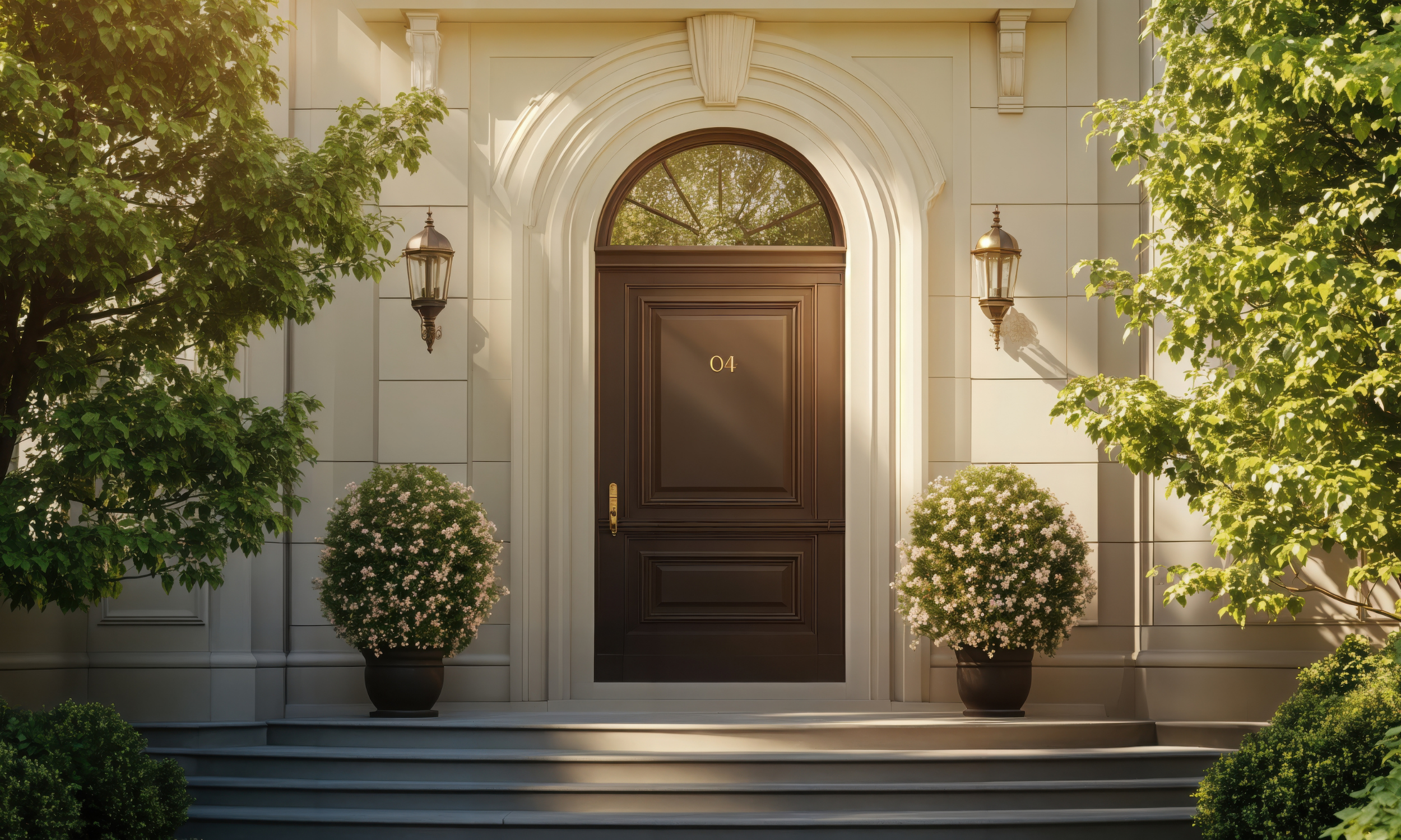 Hand holding a set of keys, including a house key and a keychain, near a door lock.